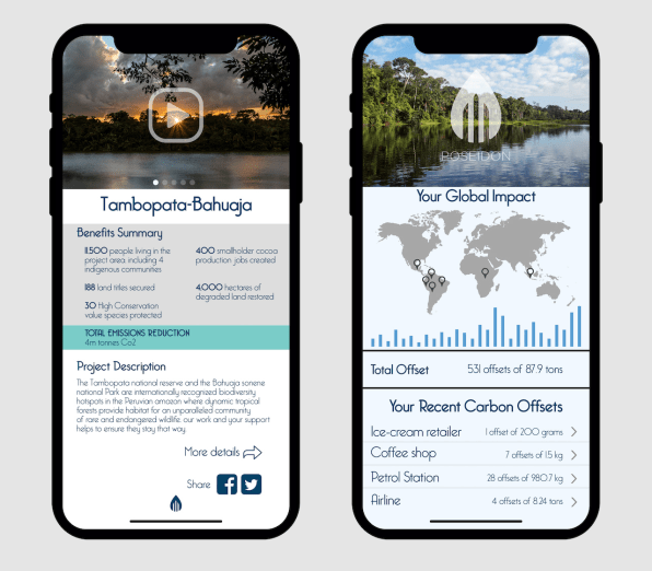 Par exemple, il est devenu possible de connaître les compensations de l’achat d’une crème glacée à la boutique de Londres. Le résultat de la compensation permet de faire croître le projet de conservation de la forêt au Pérou.