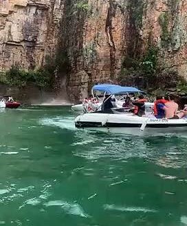 Une vidéo qui a été publiée sur les médias sociaux montre des touristes sur d’autres bateaux dans le lac Furnas qui crient « sortez de là » juste avant que le rocher ne tombe.