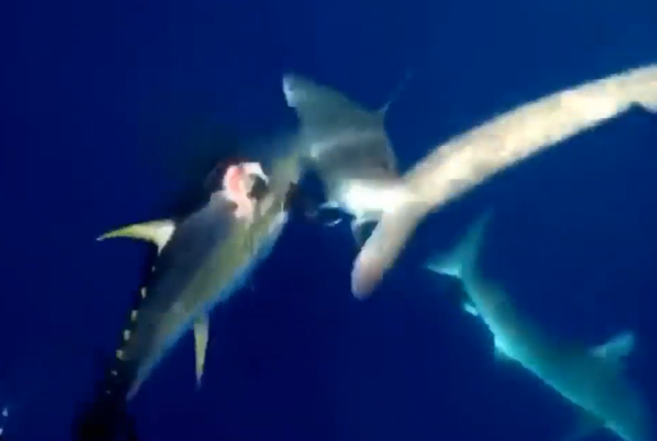 Un plongeur harponne un thon mais le sang attire très un requin. La bataille est ouverte entre eux deux.
