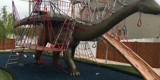 En plus il l’a fait pour ces enfants et quel enfant ne désirerait pas avoir un terrain de jeu pareil dans sa cour. D’ailleurs, ses enfants ont aussi participé à leur façon à la fabrication de ce dinosaure. Ce super terrain de jeu inclut diverses activités comme des balançoires, un toboggan, de l’escalade et bien d’autres encore.