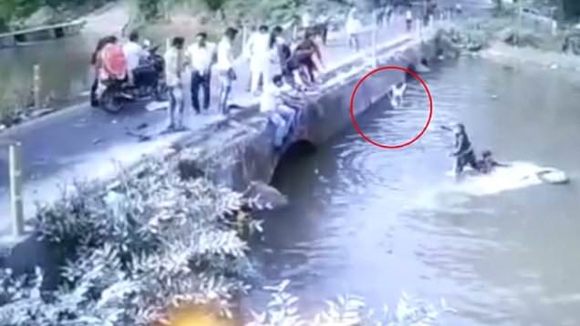 Des images de vidéosurveillance montrent une voiture blanche s’engageant sur un pont étroit situé à Niwari, en Inde.
