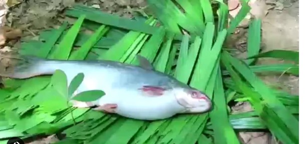 Le poisson de cette vidéo a une morphologie difforme, la partie où se trouve son estomac est un peu trop gros. Celui-ci aurait avalé quelque chose de volumineux qui l’a mis dans cet état. Une personne lui ouvre l’estomac avec un couteau. Il en sort la carapace entière d’une jeune tortue et des parties de l’intestin du poisson.