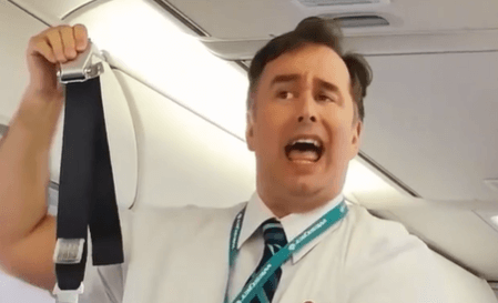 Le stewart est surement le plus drôle de tous. Regardez sa démonstration des mesures de sécurité aérienne et vous ne pourrez pas vous empêcher de rire !