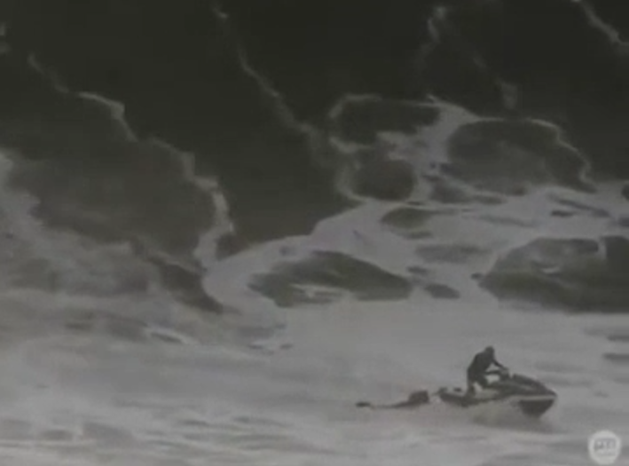 Alors qu’une énorme vague violente décolle à l’horizon, un surfeur est sauvé à temps par un homme avant que celle-ci ne le frappe.