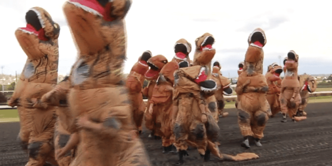 Si d’habitude l’hippodrome d’Emeralds Downs accueille les plus grandes courses de chevaux, dans cette vidéo c’est un tout en genre qui a envahi les pistes de course : la T-Rex Race.
