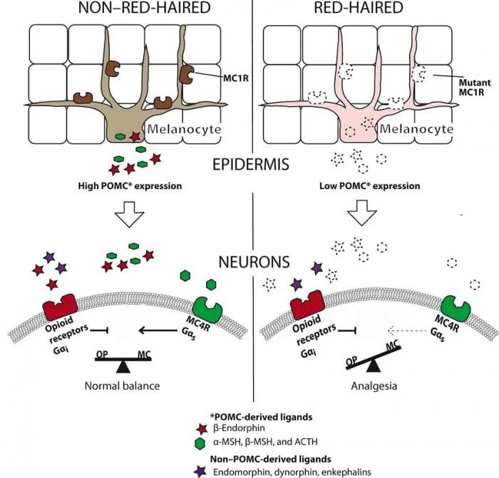 Ce dysfonctionnement des récepteurs de la mélanocortine 1 lors du processus favorise un peu plus le travail des récepteurs opioïdes qui interviennent dans le blocage de la sensation de douleur au moment où la molécule POMC se divise. Tout cela montre une relation étroite entre le pigment rouge et la tolérance à la douleur.