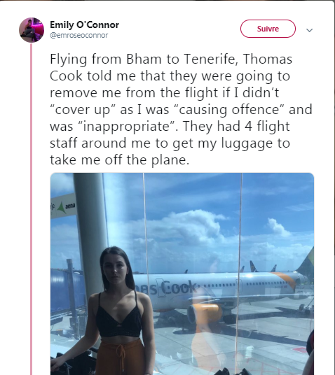 Une Britannique de 21 ans, Emily O’Connor, était au départ de Birmingham en Angleterre pour se rendre sur l’île espagnole de Tenerife, quand des membres d’équipages de la compagnie Thomas Cook Airlines l’ont menacé de l’expulser du vol si elle ne se couvre pas.