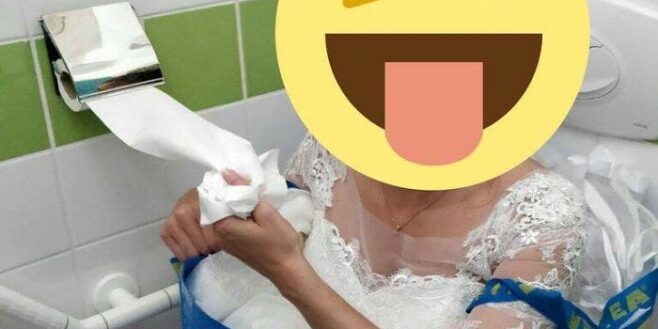 Aller aux toilettes est souvent assez pénible pour une mariée à cause de sa robe et elle l’a réalisée avec un sac Ikea.