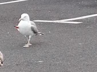 Bien que blessée, la mouette arrivait encore à marcher naturellement, à monter sur le trottoir, et même à fuir devant un autre oiseau.