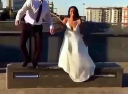 Une photo d’un saut entre un couple de nouveau marié ne se passe pas comme prévu. La jeune mariée qui saute va se tordre violemment la cheville.