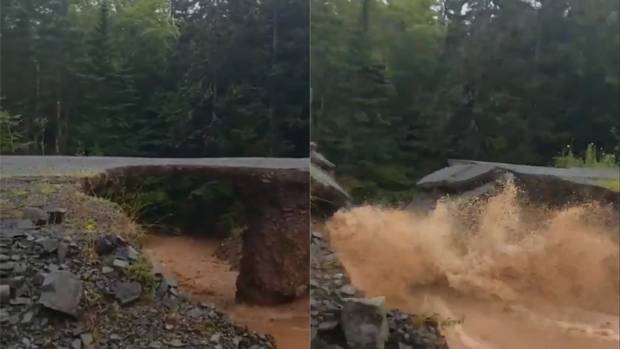 Le moment où une route s’est littéralement effondrée et a disparu dans une rivière lors d’inondations au Canada a été filmé. Dans la vidéo, on entend une personne disant : « Même si nous étions en retard de deux heures et qu’il faisait noir dans la région, cela aurait pu être bien pire ».