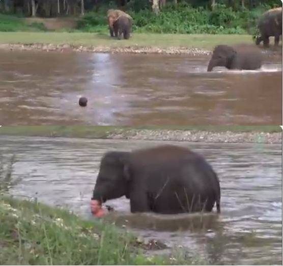 L’incident a effectivement eu lieu en 2016 dans le parc naturel des éléphants en Thaïlande. La vidéo montre Kham Lha, l’un des plus jeunes résidents du sanctuaire des éléphants, en train de se dépêcher pour sauver son ami, Darrick Thomson.