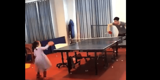 Dotée de réflexes parfaits, cette petite pongiste nous en met plein les yeux au cours d’un duel entre une fillette et un adulte.