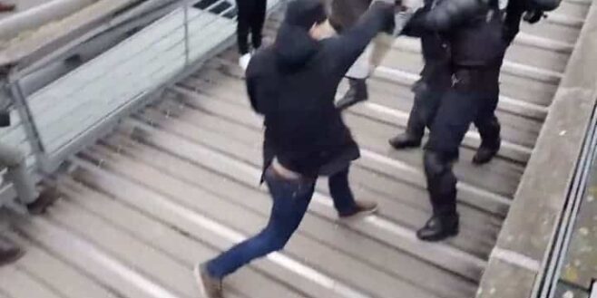Une bonne année pour ces CRS qui en prennent pour leur compte par ce grand boxeur cagoulé. Ce dernier sera arrêté par la suite pour cette violence sur des forces de l’ordre.