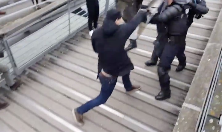 Une bonne année pour ces CRS qui en prennent pour leur compte par ce grand boxeur cagoulé. Ce dernier sera arrêté par la suite pour cette violence sur des forces de l’ordre.