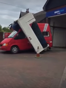 Le mal est fait, une Ford Transit sort d’une station de lavage en entrainant le rouleau de lavage avec elle. Causant des dégâts loin d’être anodins pour le propriétaire qui doit procéder à des réparations.