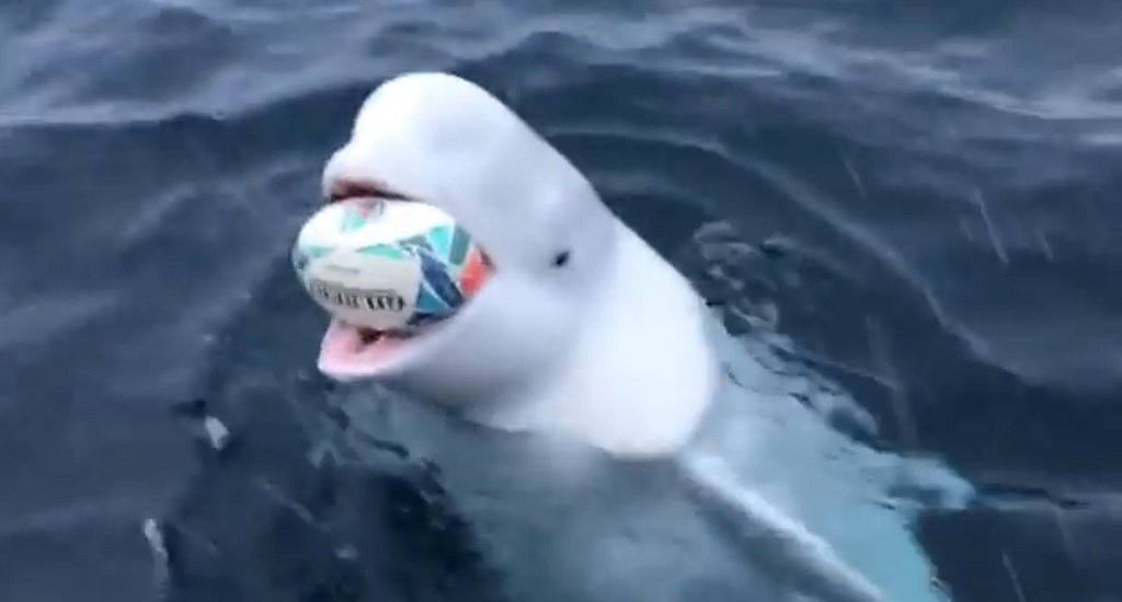 On peut y voir le béluga rapporter un ballon de rugby à un homme sur bateau, qui le relance aussitôt à la mer.