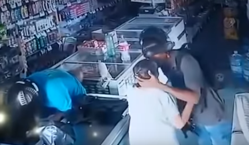 Puis, le voleur s’est penché vers elle et l’a embrassé sur le front tandis que son acolyte a continué à dévaliser le magasin.