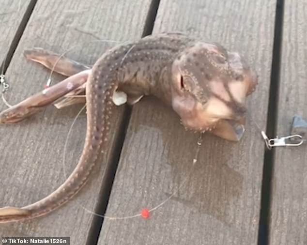 Des images postées sur Tik Tok sous le nom de Natlie1526n montrent le monstre marin en train de se tortiller sur le pont d’un bateau de pêche.