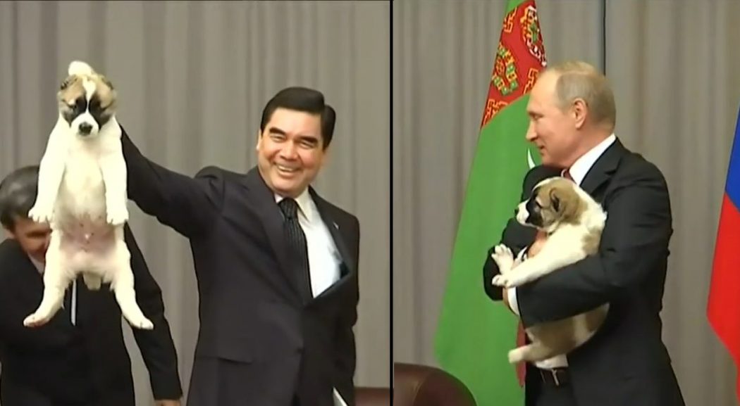 À l’occasion de son anniversaire ,Vladimir Poutine, le président de la Russie, a reçu de la part du président du Turkménistan un adorable petit chiot Berger d’Asie centrale vu que Vladimir aime beaucoup les chiens.