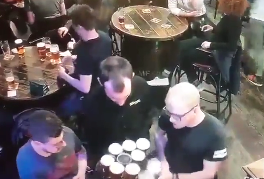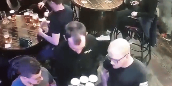 Le serveur, bien poli, s’attarde sur la table des clients et présente vivement ses excuses pour le désagrément. Les clients, eux, très compréhensifs, l’aident à remettre les verres en place tandis que les autres consommateurs dans le bar l’encouragent avec des applaudissements.