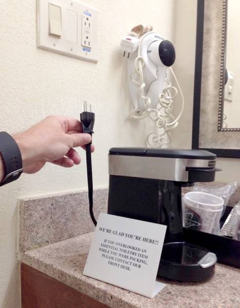 Une vraie déception pour les amateurs de café. En effet impossible de préparer du café sans prise de courant. Le comble de l’ironie, c’est le petit mot d’accueil de bienvenue.
