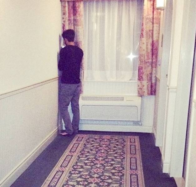 Petit problème logistique pour cet homme qui se trouve être plus grand que la chambre. Il y a de ce quoi se sentir tout à coup géant.