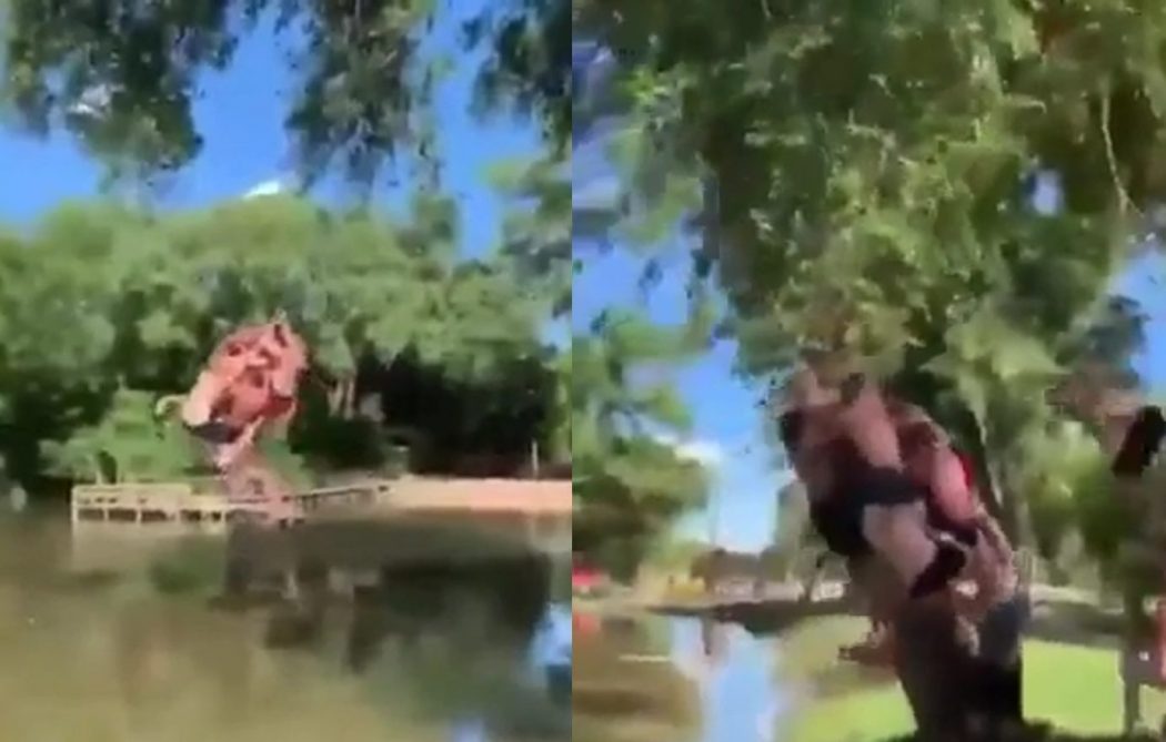 Un groupe d’amis s’amusaient ensemble autour d’un lac quand ils ont décidé de s’accrocher tous ensemble à une corde qui se pendait d’un grand arbre.