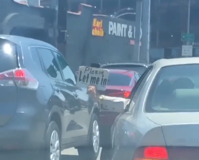 Ayant le sentiment que la file de gauche avance plus vite, ce conducteur choisit de suivre cette voie. D’abord il met son clignotant gauche, puis il sort une petite pancarte sur laquelle il demande gentiment s’il peut passer sur l’autre ligne.