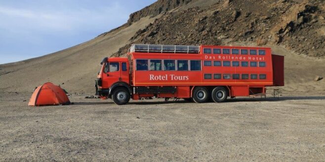 Ce sont des mastodontes roulants, qui peuvent loger 20 à 40 personnes. Ces immenses bus tout-terrain sont à mi-chemin entre et les camions de pompier et les bus rouges londoniens. Les “Rotels“ sont en fait des hôtels roulants, d’où le mix entre rolling et hôtels.