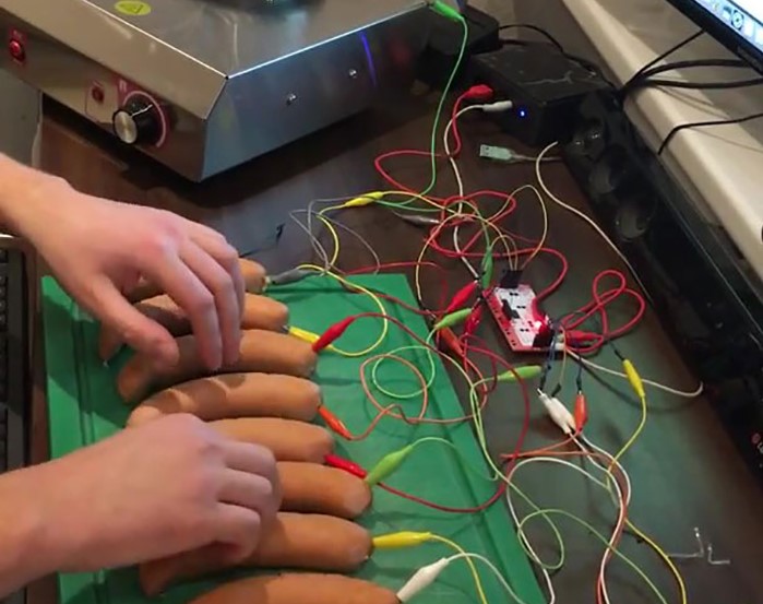 Il les a reliées avec des fils à un équipement sonore. Ainsi, quand on appuie sur une saucisse, il y a une note de piano qu’on entend. On peut donc jouer des petites mélodies en appuyant individuellement ou simultanément sur une ou des saucisses. Malgré le manque de touche, il est possible d’avoir différentes chansons avec les 10 saucisses.