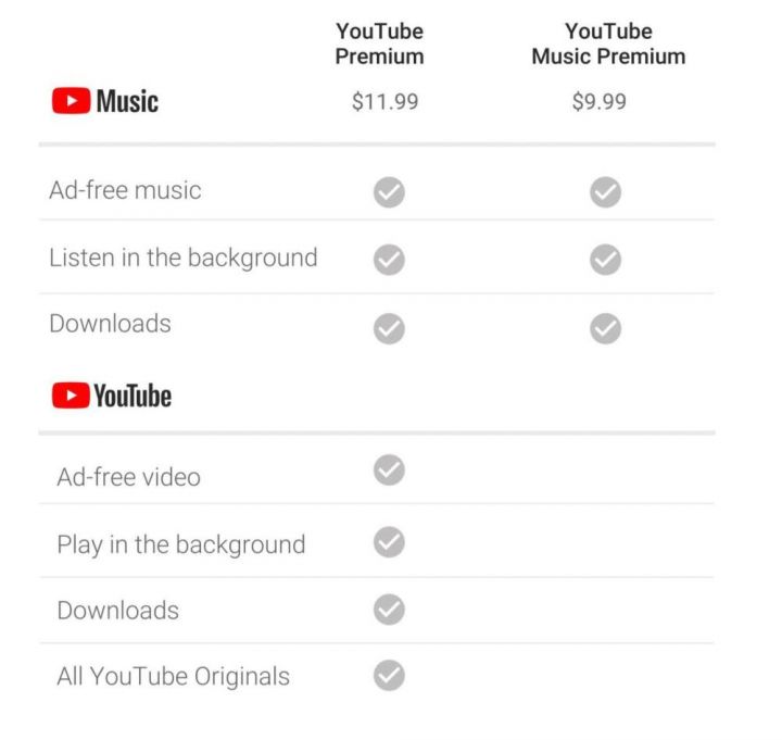 YouTube Music comprend une version gratuite et pubée et un mode payant et sans publicité, le YouTube Music Premium dont l’abonnement est de 9,99 $ par mois. Les actuels abonnés à Google Play Music auront automatiquement accès à ce nouveau service. Google Play Music est d’ailleurs en train d’être déprogrammé progressivement selon USA Today, bien que la date de sa disparition effective n’ait pas encore été fixée.